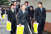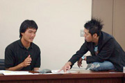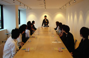 本学で開催した佐藤可士和作品展の設営を手伝う、学生サポーターの面接が行われた。サムライにて。