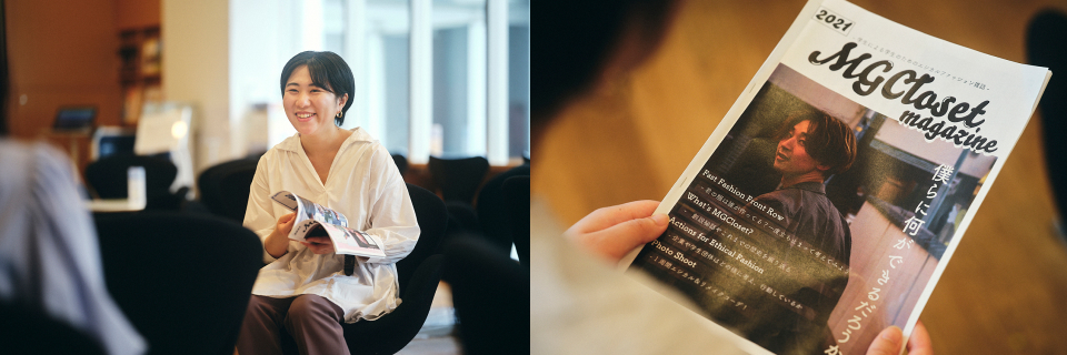 タイトルは「-学生による学生のためのエシカルファッション雑誌-MG Closet magazine」。エシカルファッションとは、「環境を破壊しない」「労働者から搾取しない」といった基準に基づいて作られたファッションのことです。雑誌にはファストファッションの裏側や、MG Closetが立ち上がった経緯などを掲載。さらに、団体メンバーの一人がアルバイトをしている「GU」の洋服回収の取り組みや、他大学のエシカルファッションに取り組む団体などを取材しました。「リメイク古着で1週間エシカル&リメイクコーデ」といったコーナーも設けています。