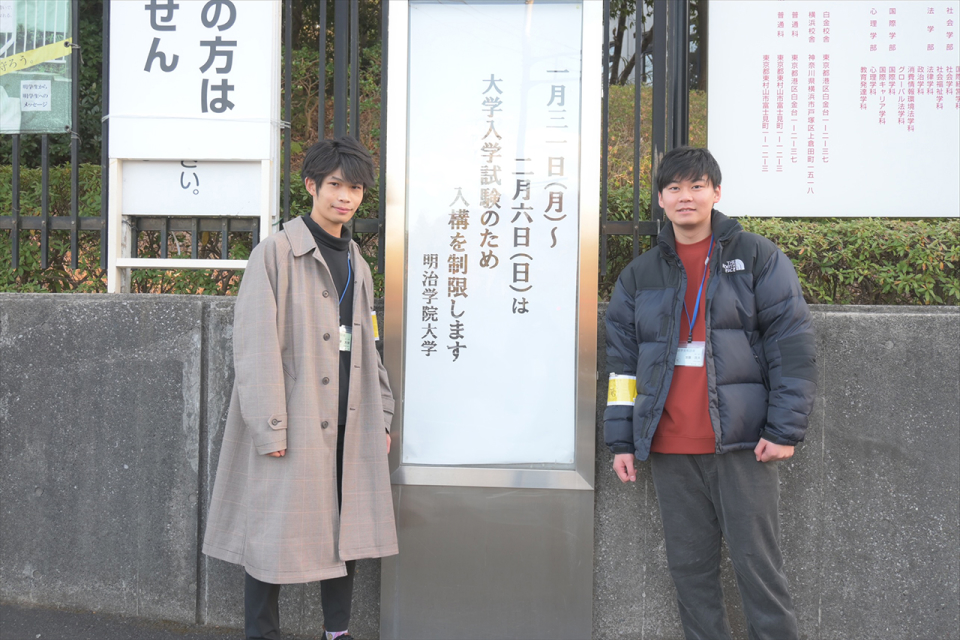 中学から同級生の加藤洸大さんと小宮大世さん。横浜キャンパスでSCとして一緒に活躍中です。入試を滞りなく進めることに貢献し、受験生に寄り添うSCとしてやりがいを感じています。