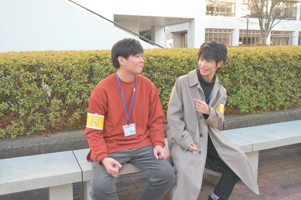 1年次に、横浜キャンパスで入試SCの募集要項を見かけ、大学入試に携わる仕事とはどんなものだろうと興味を持ったことがSC応募のきっかけです。1人で応募するのは少し不安だったので、学校行事に興味がありそうな小宮さんに声をかけたところ、快諾してくれたので一緒に応募しました。小宮さんとは地元が一緒で中学校から高校、大学と一緒に進学してきました。高校時代は一緒にハンドボール部に所属。共通の友達も多く、思い出話などでも盛り上がる、気の合う友達です。