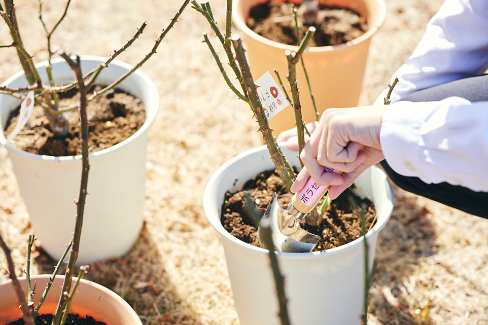 横浜キャンパスでさまざまな企画を展開している学生と教職員の活動「横浜キャンパスプロジェクト」とも協力し、「明治学院大学ボランティアファンド学生チャレンジ」から費用の援助を受けて今回の植樹が実現。当日は、横浜在住の本学卒業生でもある、日本原水爆被害者団体協議会事務局次長の和田征子さんが来学くださり、お話会も開催しました。現在、5鉢のバラがメンバーの世話を受けて育っています。ピンクの花が咲くのが楽しみです。