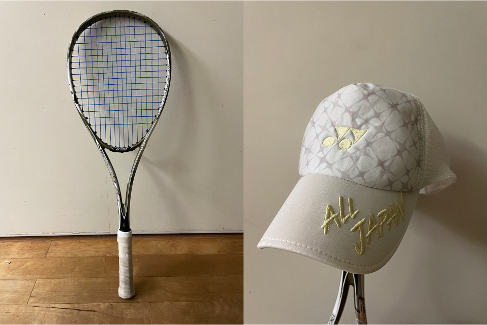 ソフトテニスを続けている中で大事にしているアイテムが2つあります。 まず、中学時代に先輩からもらったラケットです。新しいラケットが発売されても、この大切なラケットに愛着があり、自分の手に馴染んでいて打ちやすいので今でも使い続けています。