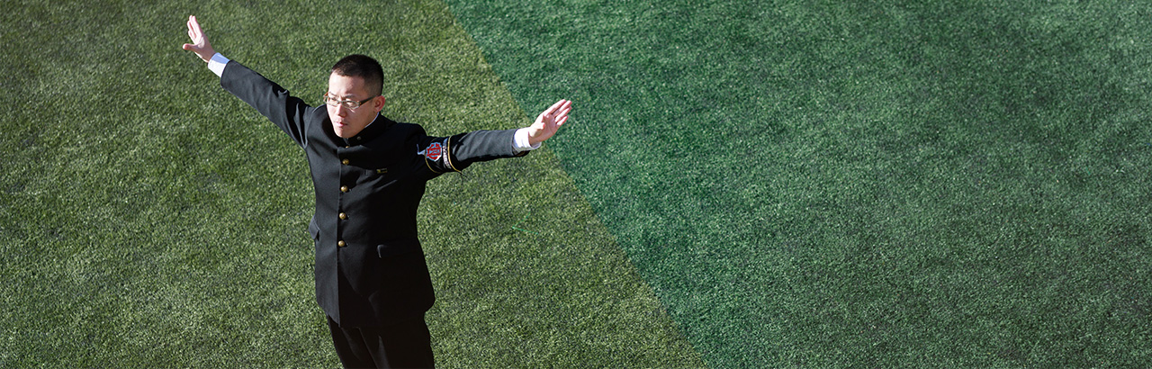 入学式翌日の横浜キャンパスで行われたサークル勧誘では應援團リーダー部のブースに直行。迷わず入部を決めました。当時、リーダー部の部員数は私を含め4名のみ。同期がおらず、4名中2名は4年生の先輩でした。リーダー部としての行く末が案じられていたこともあり、先輩方からの指導は大変厳しいものでした。指導内容に納得がいかないこともありましたが、團長となった今、当時の指導のありがたみを感じています。毎日早朝から夜まで、部の庶務や演舞の練習に明け暮れる日々。体育会団体のシーズンである夏休み以降の土日の多くは試合の応援活動のため、1年があっという間に過ぎていきました。