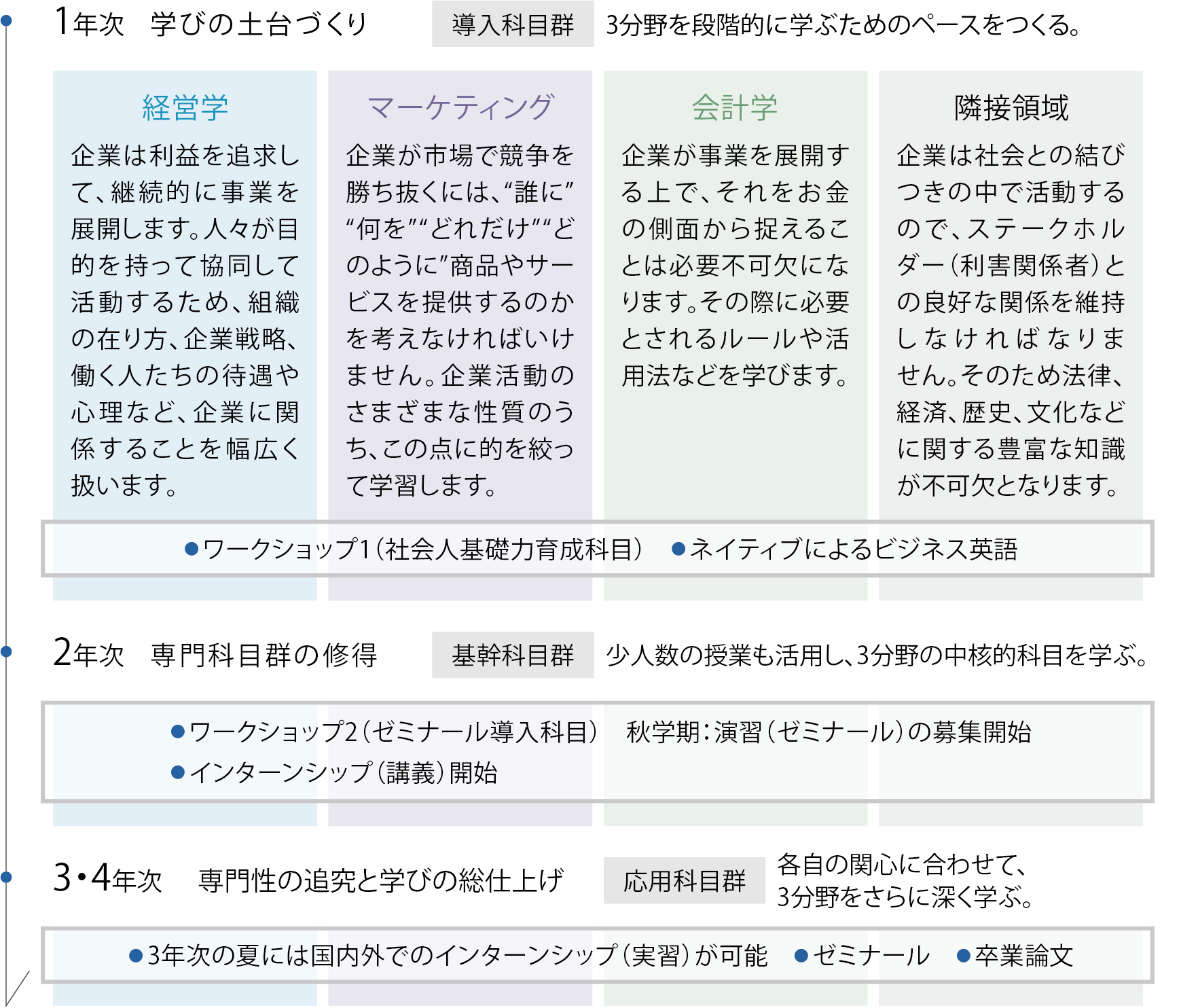 経営学、マーケティング、会計学に関する導入科目群や経済学と法律の基礎を固めた後、2年次には少人数の参加型授業で専門科目の核となる基幹科目群を学びます。3年次より10名程度のゼミで専門分野を深く学び、応用科目群も学習。積み上げた体系的な知識や分析力、表現力などを活かし、早い段階で進路を確定します。
