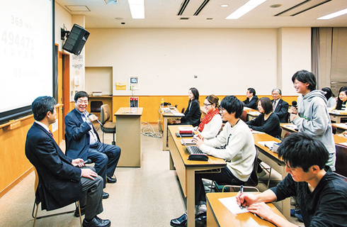 キャリアセンターの学生支援とは別に、学部独自の支援策として課外指導を用意。大企業の人事・採用・教育部門に関わった外部講師による講義や模擬面接、自己PR指導などを行っています。