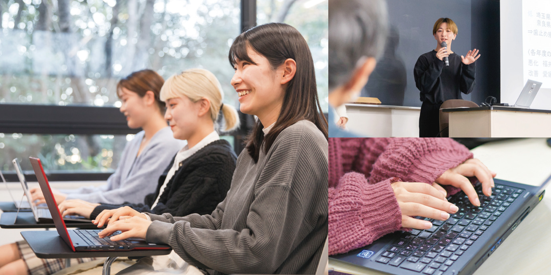 全学年で1クラス12名程度の少人数の演習(ゼミ)で国際学科の学びを深めます。信頼し合える仲間と議論する学びのコミュニティで、批判的思考力とコミュニケーション力を養います。最終年度には、これらの学習と経験の集大成として、クラス全員でアドバイスし合いながら「卒業論文」を執筆します。