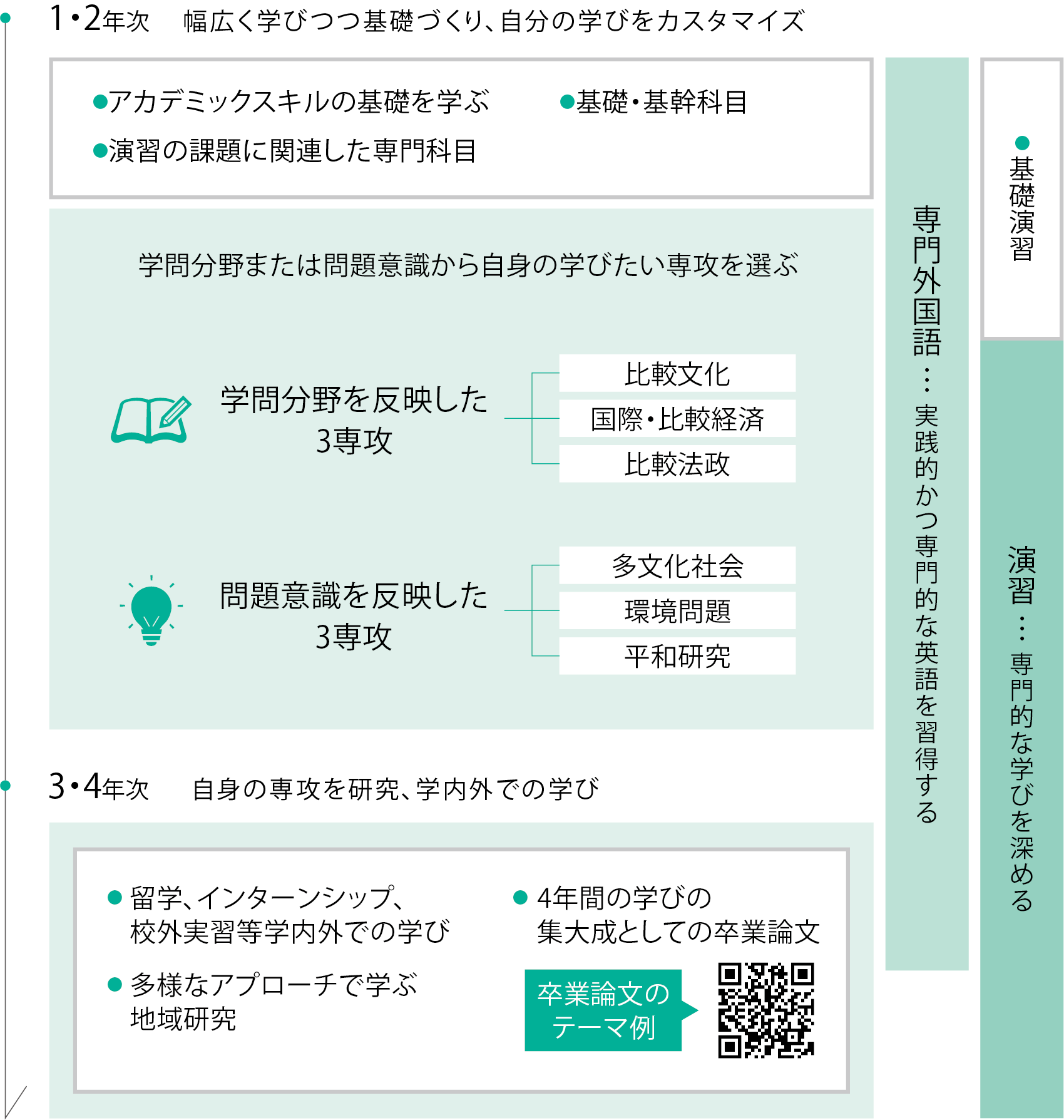 1年次から少人数教育(基礎演習)と基礎的な科目を通じて、学際的な学びの土台づくりをします。2年次からそれぞれの関心に基づき演習と専攻を選択し、学びのコアを決定します。3・4年次で専門的に学びを深め、4年次で学びの集大成として卒業論文を作成します。