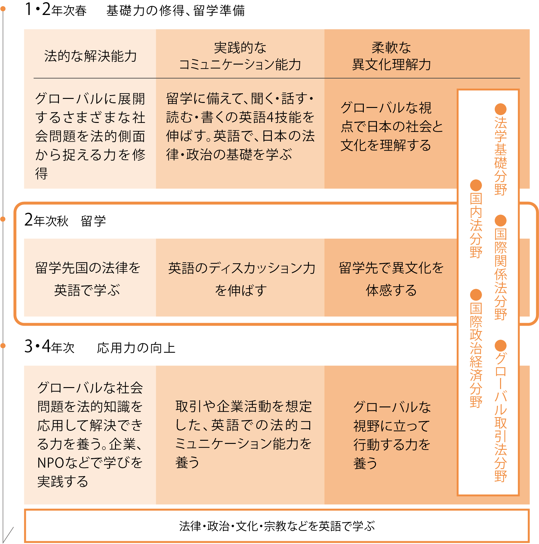 留学前の準備として英語の4技能を身に付ける科目や日本法を英語で学ぶ科目、帰国後の応用・発展科目として法律・政治・文化を英語で学ぶ科目やビジネス英語を学ぶ科目などを設置しています。