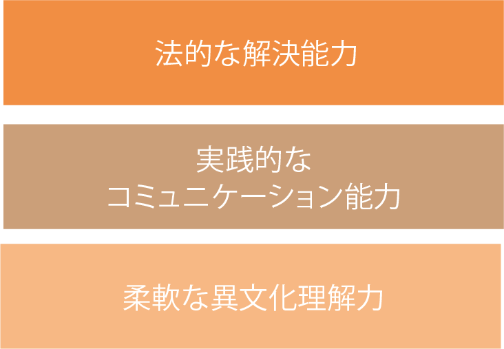 海外進出による国際化だけでなく、日本国内では「内なる国際化」が急速に進行し、数多くの外国につながる人々が生活しています。二重のグローバル化に対応するため、法的知識や問題解決能力に加えて、グローバル社会において通用するレベルの英語力と異文化理解力を身に付けます。