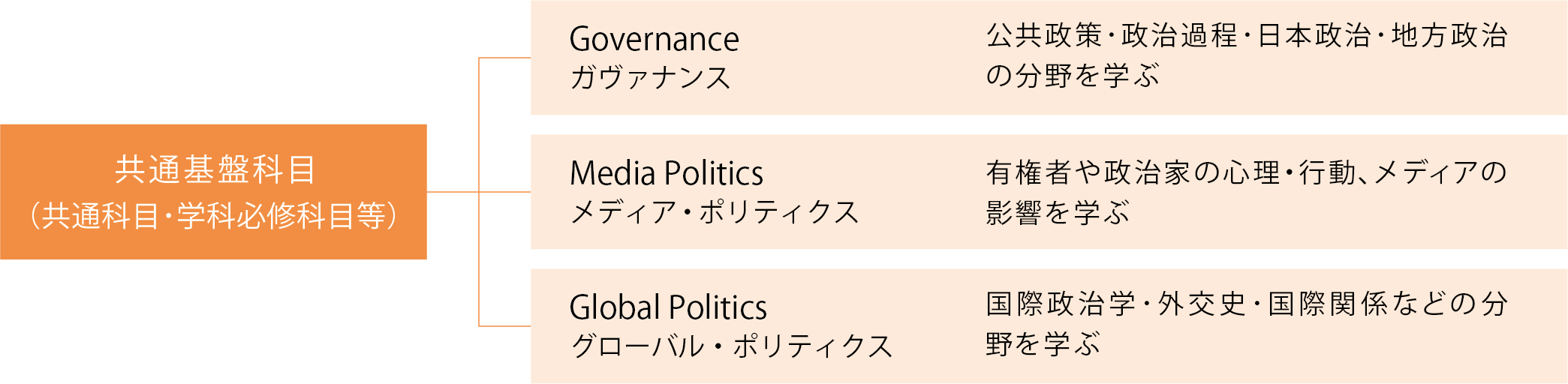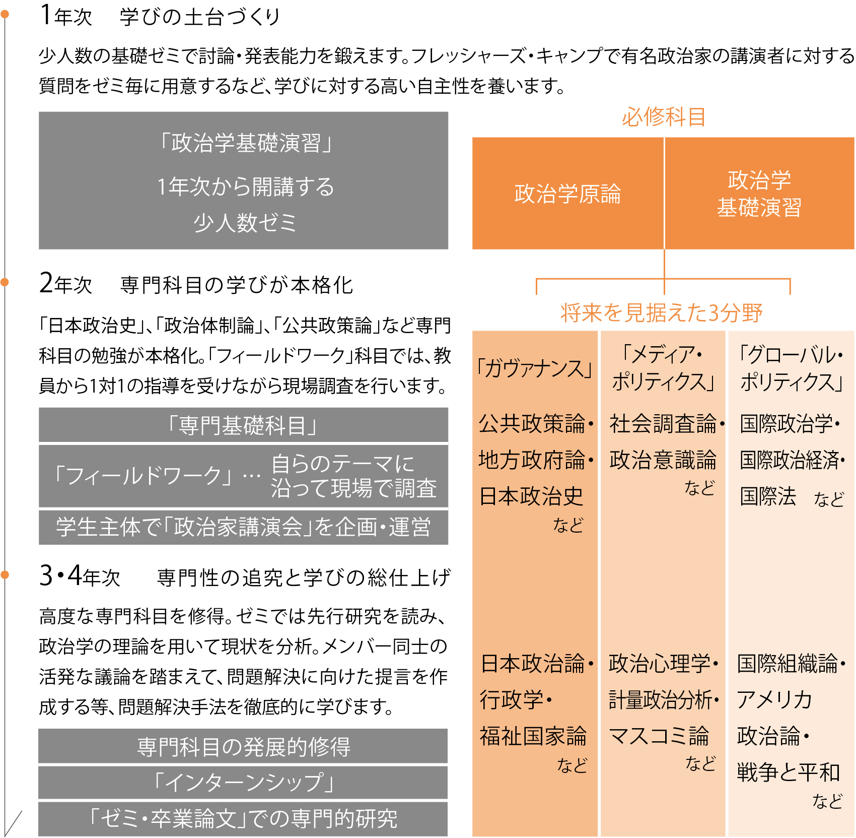 必修科目は「政治学基礎演習」と「政治学原論」の2つのみ。1年次に政治学の基礎となる科目を履修した上で、公共政策や地方政治がテーマの「ガヴァナンス」、計量政治マスコミがテーマの「メディア・ポリティクス」、国際関係・外交がテーマの「グローバル・ポリティクス」の3分野から、目指すキャリアや関心に応じて、自分の学びたい科目を自由に選ぶことができます。