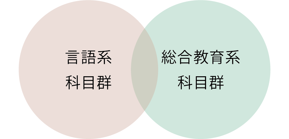 選択必修:フランス語、ドイツ語、スペイン語、ロシア語、中国語、韓国語を選択言語科目として配当する。