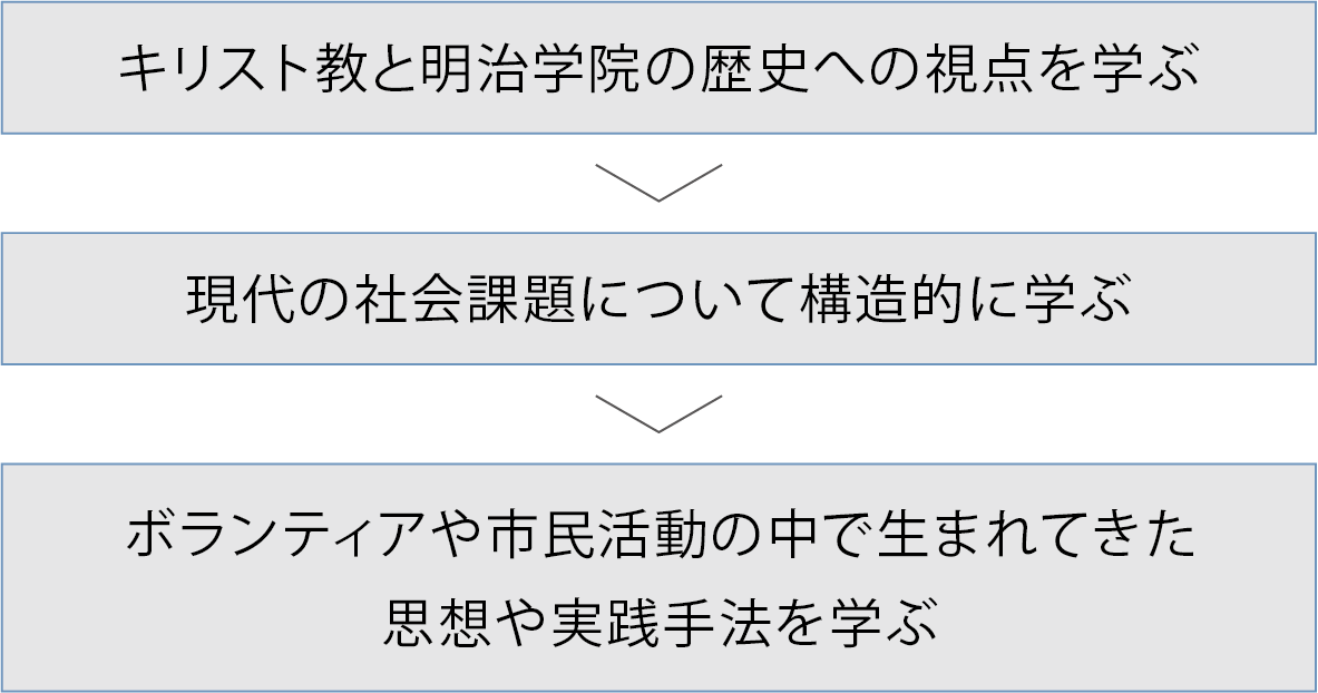 教育理念“Do for Others”について体系的に理解することが本コースの目的です。キリスト教や本学の歴史から社会貢献活動の精神を学修。さらに、社会課題への理解を深め、ボランティアや市民活動の思想や手法を実践、理論の両面から学びます。