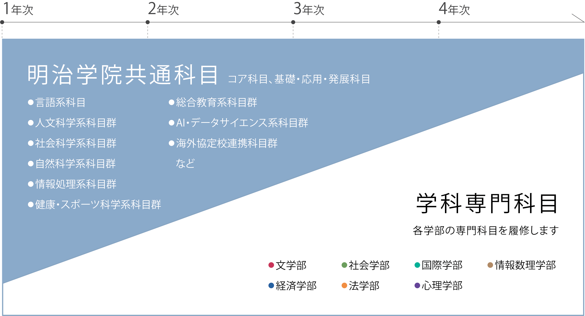 明治学院共通科目を、コア科目、言語系科目群、人文科学系科目群、社会科学系科目群、自然科学系科目群、情報処理系科目群、健康・スポーツ科学系科目群、総合教育系科目群,AI・データサイエンス系科目群,海外協定校連携科目群の各群により構成する。効率的な教育効果を期待して、コア科目に加え、基礎,応用,発展のレベルを設定することにより、順次的,体系的な学修を促進できるように科目を編成する。