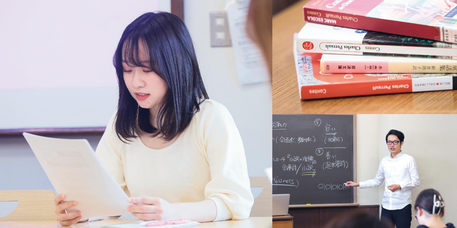 私は何をしたいんだろう、何ができるんだろうと考え込むよりも、今の環境とはまったく異なる場所に、思い切って身を投じてみる。新たな出会いをいくつも経験しながら、自分はこれだというスタイルを手に入れる―フランス文学科の授業には、中世の吟遊詩人から近代の画家や小説家、20世紀の思想家、映画監督に至るまで、さまざまな時代の、刺激的な人物たちが登場します。その思いがけない言葉や不思議な発想のかずかずに触れながら、自分自身をより深く捉え、世界をより鋭く感じとるための、新たな、もう一つ別のアンテナをつくっていきます。