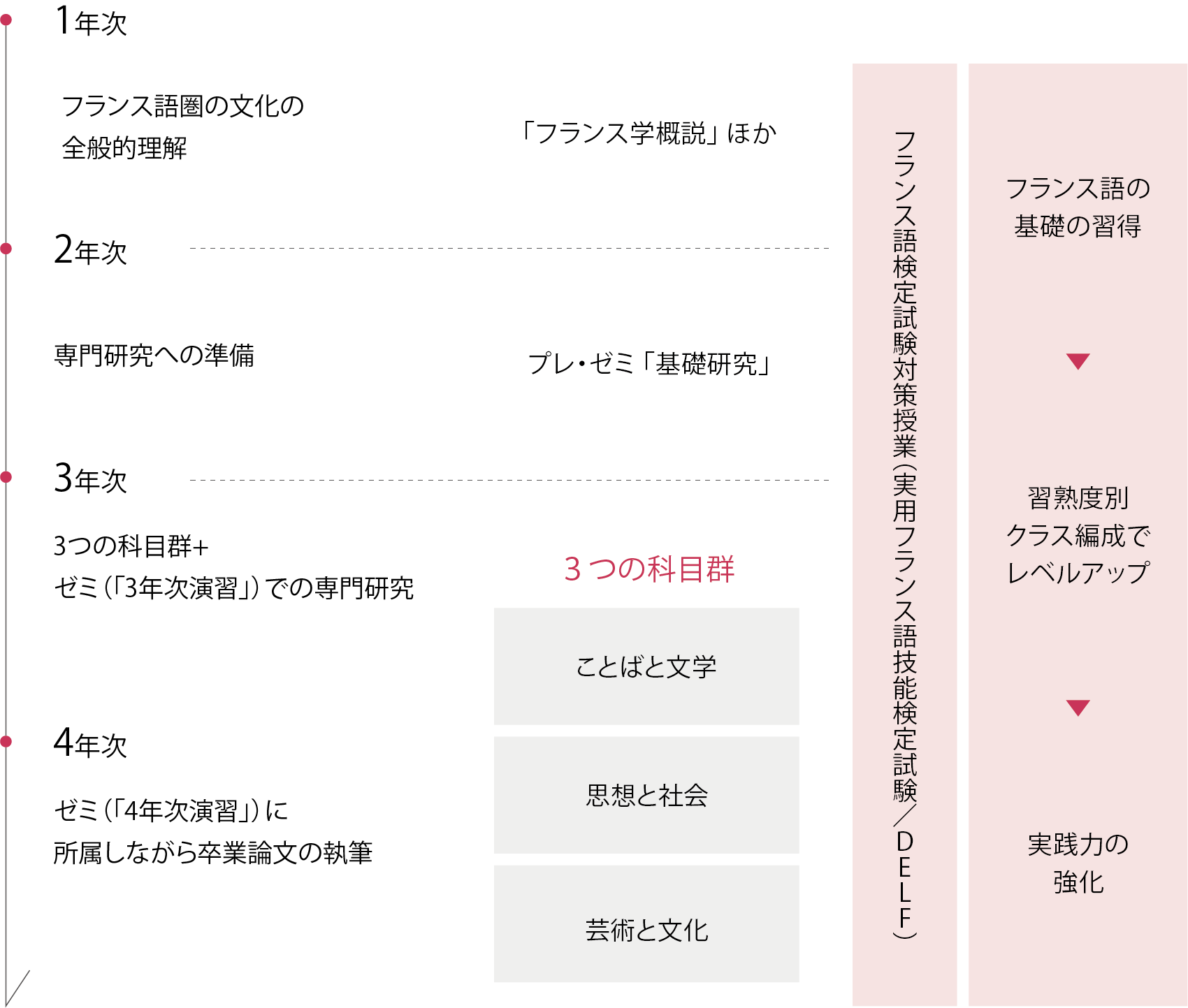 フランス文化のありようを理解するには、まずは言語の習得から始めましょう。3年次からは、多種多様な専門科目(「3つの科目群」)や少人数制のゼミ(演習)が始まります。卒業論文(必修)は4年間の集大成です。自説を説得的に展開するすべを身に付けます。