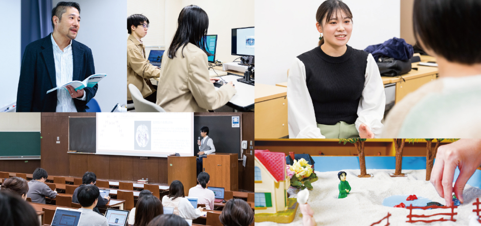心理学部が開設されたとき、教員全員で考えた教育理念が「こころを探り、人を支える」です。心理学の基礎を学び、その学びを他者への心理支援に活かすことができる人材を育てたい、という教員の強い願いが込められた教育理念なのです。心理学科には基礎から臨床まで多様な分野の専門家がそろっており、人のこころや行動、人間関係のメカニズムを深く学ぶことができます。2010年に開設された教育発達学科は、心理学、教育学(初等教育)、障害科学の3領域を融合した「教育発達学」の学びを通して、子どものこころと発達をめぐる現代的な課題を探究します。そして、学齢期における子どものこころを理解し、こころの成長を支援できる教員をはじめとして、学校や社会における多様な教育的課題に取り組むことのできる人材育成を目指します。