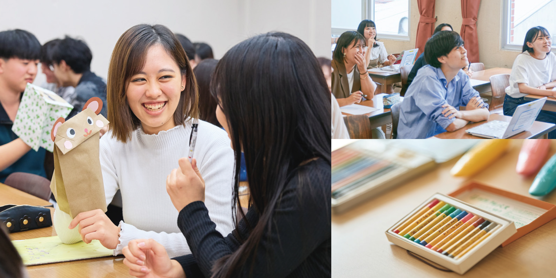 1年次は子ども理解の基盤となる学びが中心。2年次からは専門性や進路に応じた3つのコースから一つを選択。教育現場で求められる多様な支援の在り方に対応する力を身に付け、進路を多彩に広げます。学科の教員の専門性は多岐にわたり、学生の関心に応じた学びと進路を導きます。