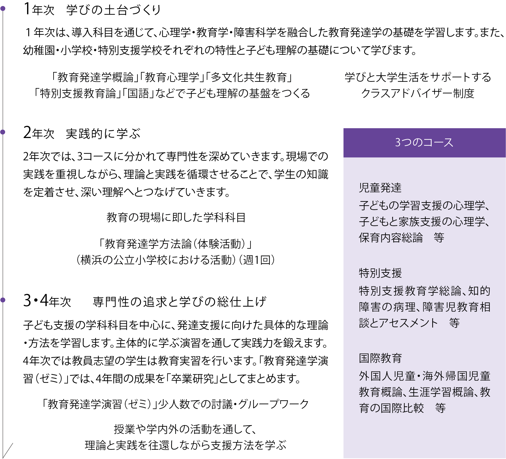 まず教育発達学の導入科目で、心理・発達・障害の問題を含む子ども理解の基礎を学習。2年次は3コースに分かれて、現場での実践も重視しながら専門性を深めていきます。3年次からは子ども支援の学科科目を中心に、子どもの発達支援に向けた具体的な理論・方法を学習。学生が主体的に学ぶ演習を通して実践力を鍛えます。