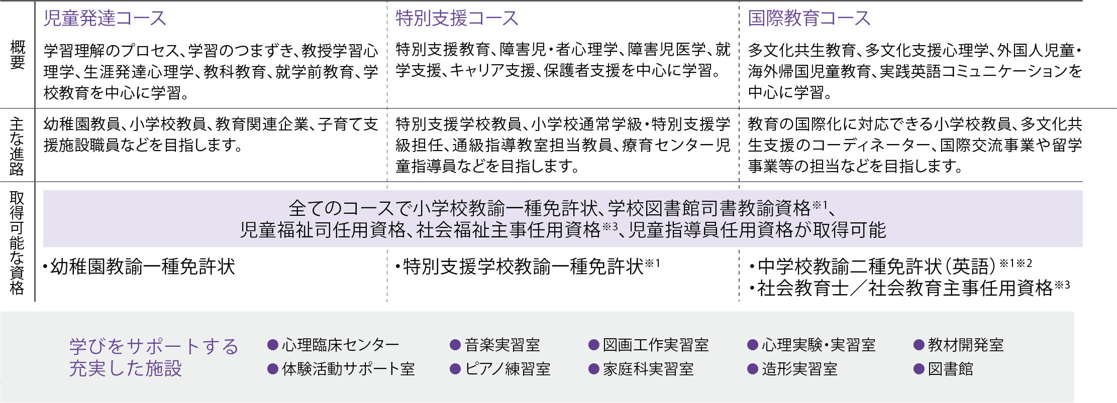※1 小学校教諭一種免許状と併せて取得する必要があります。 ※2 他学科履修による副免許。各学年5~10人程度、選考あり。 ※3 国際教育コース以外の学生でも、各コースで指示された科目の履修を満たした上で、所定の科目を履修すれば取得することが可能です。