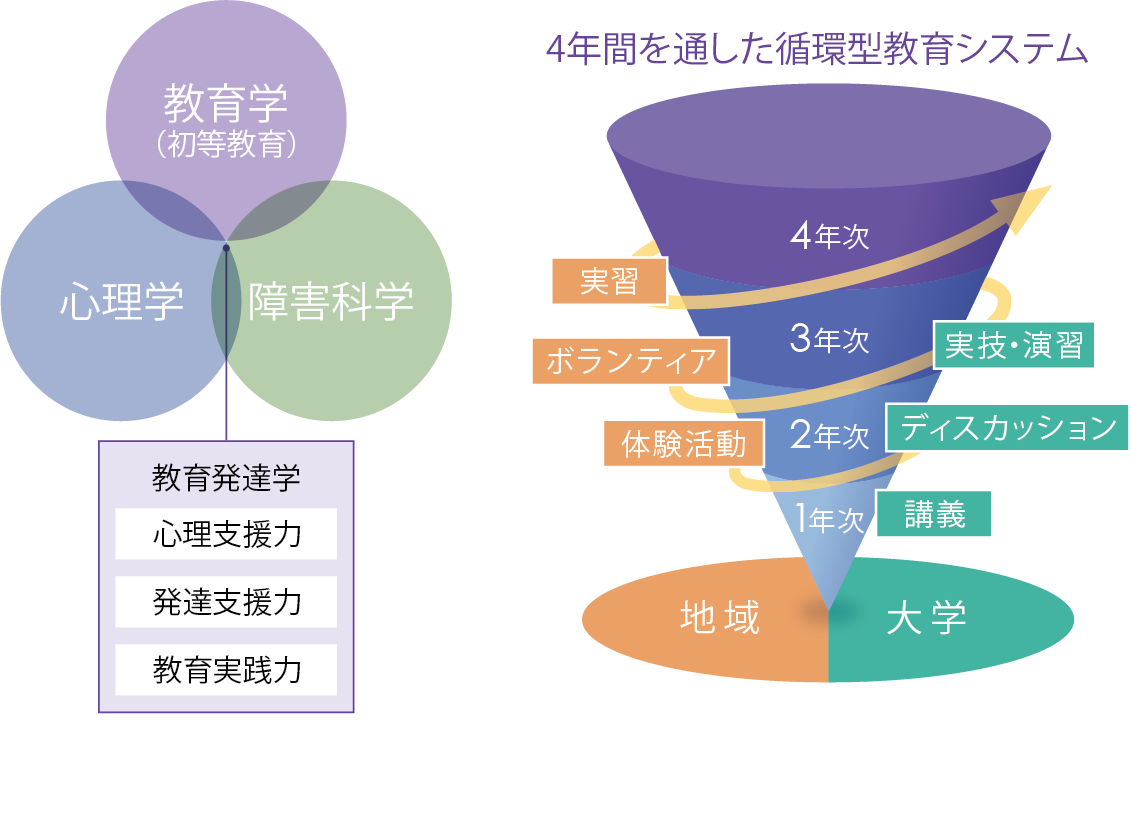 現代の子どものこころをめぐる問題には、発達や障害のメカニズムを理解した上で生活全体を視野にいれて包括的にアプローチすることが必要です。教育発達学科は、循環型教育システムを通して、子どもの理解と支援に関する学びを深め、①問題の予防と解決ができる力、②計画・実践・評価・改善サイクルを通じた個別支援と集団指導を行う力、③教科指導と生活指導を関連付けて実践する力を備えた、「こころを育て、子どもを支える」人材を育成します。