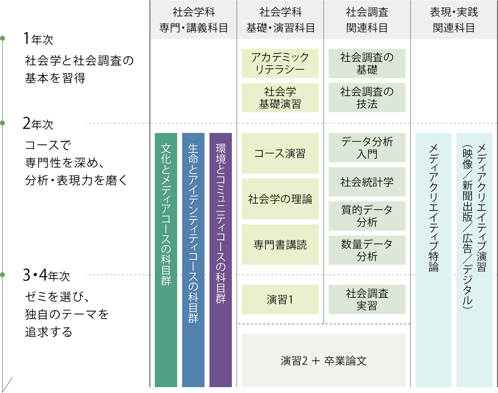 1年次より少人数教育と社会調査関連科目で、社会学と社会調査の知識と方法を身に付けます。2年次からは3つのコースから一つを選択して、関心のあるテーマを重点的に学習します。3・4年次ではゼミを選択し、それぞれの関心にしたがって専門的に学びを深め、ゼミや社会調査実習で培った経験と実績をもとに卒業論文を完成させます。