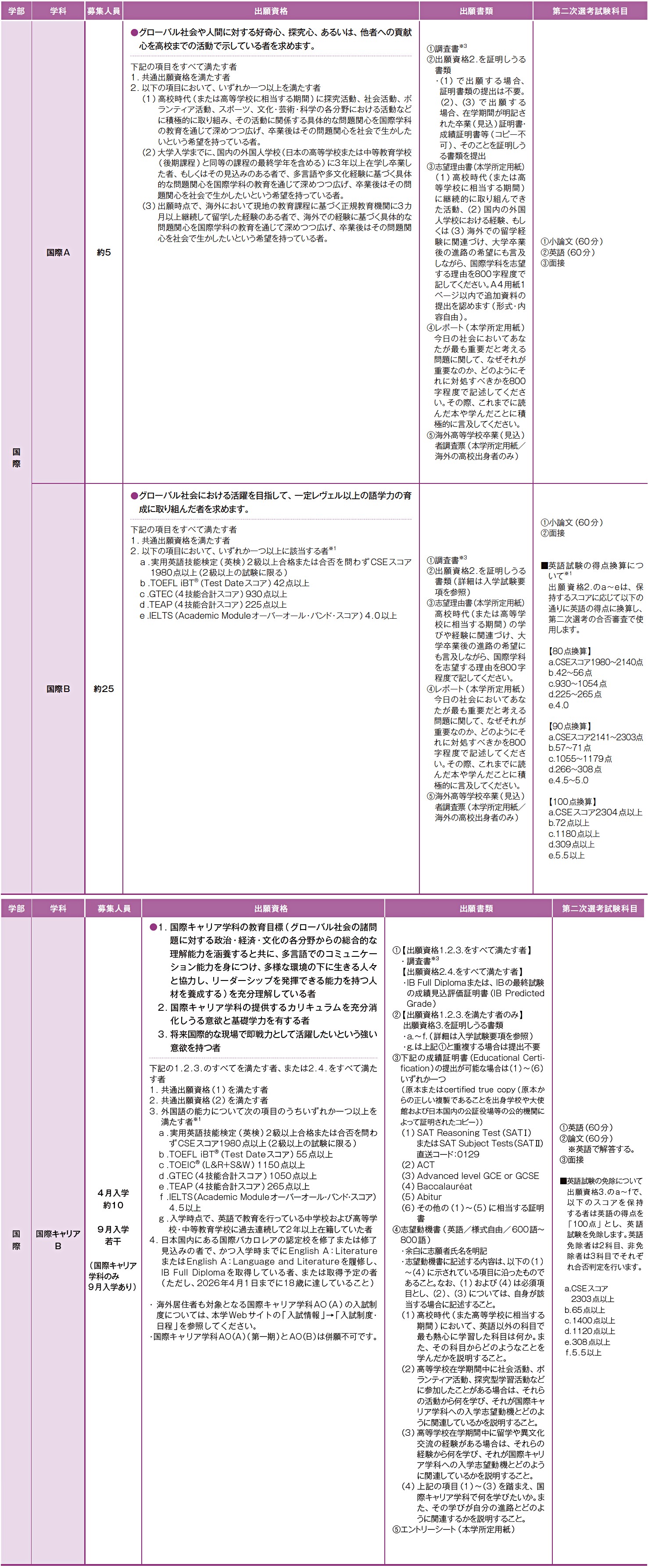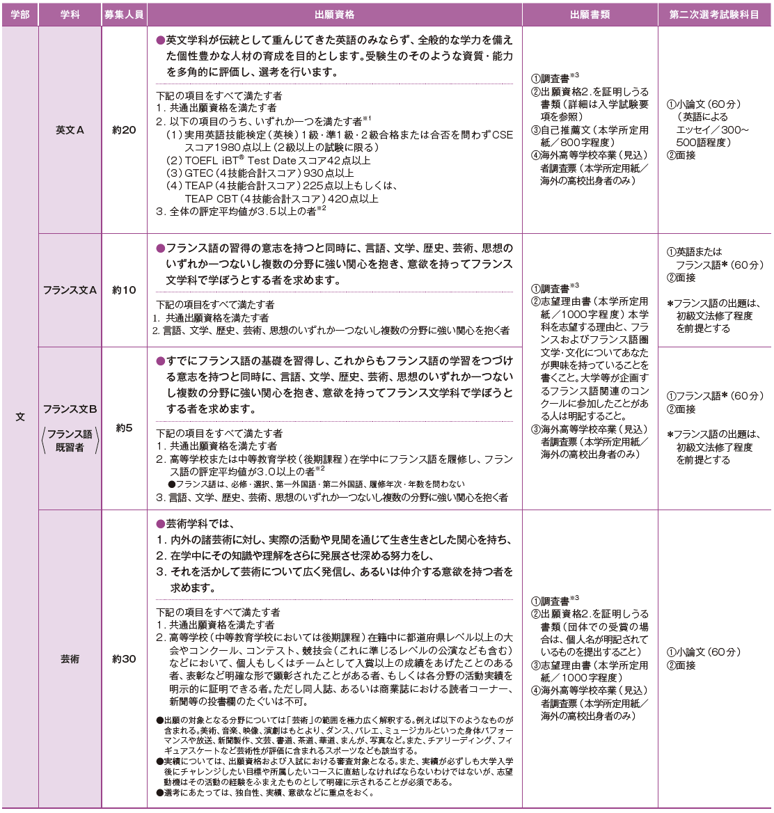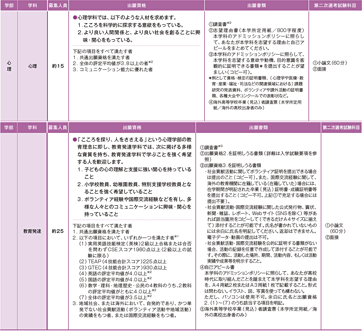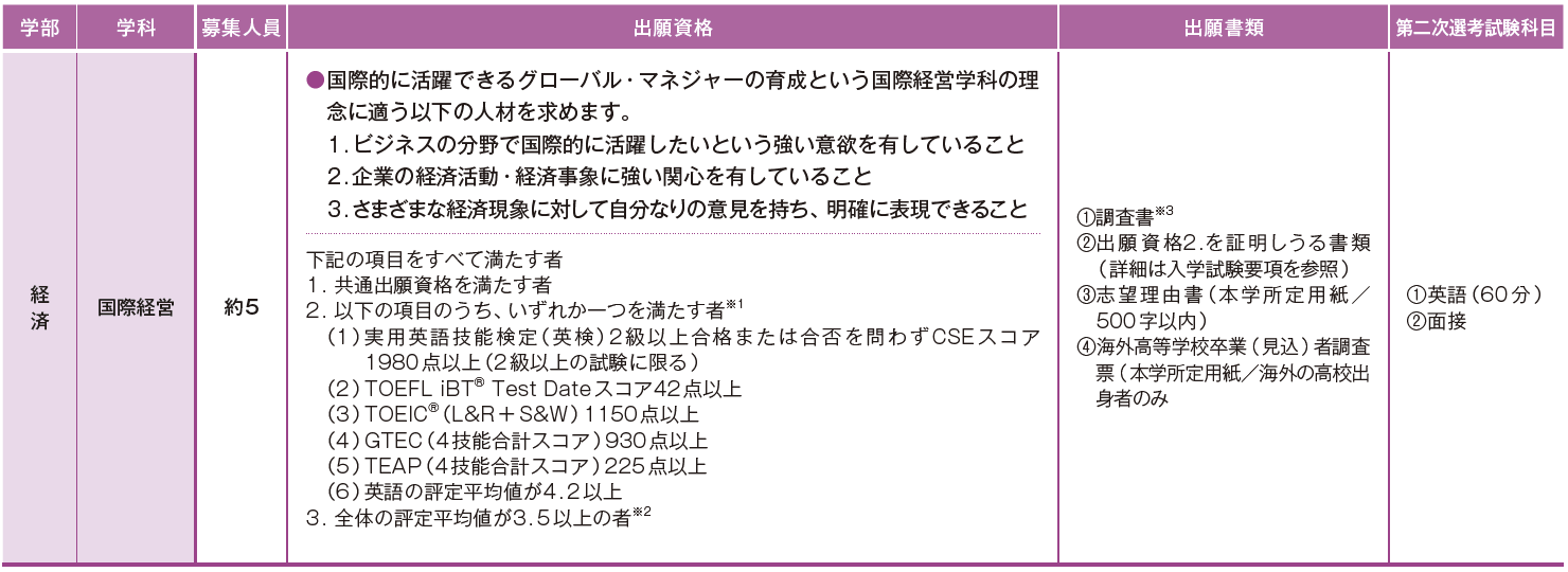 ※1 英語外部検定試験は、出願締切日より2年以内に受験した試験結果のみ有効であり、TOEIC®を除いて異なる試験日、試験回のスコアの合算は認めません。なお、TOEIC®はL&RのスコアにS&Wのスコアを2.5倍して合算したスコアとします。また、実用英語技能検定(英検)はS-CBT・S-Interviewも可とし、CSEスコアに関しては、スコアが基準を満たしていれば合否は問いません。ただし、2級以上の試験に限ります。GTECは検定版のほかにCBTタイプも可とします。TOEFL iBT®はHome Editionは不可とします。