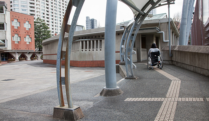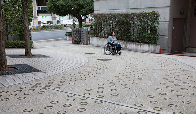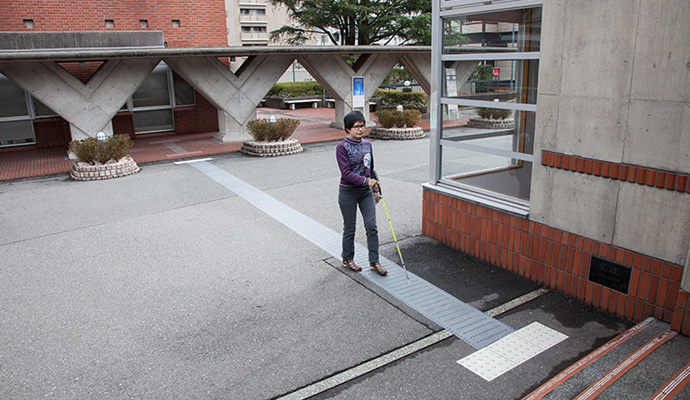本館と3号館の間には、エスコートゾーンが敷設されており、視覚障がいのある方でも、スムーズに移動することができます。