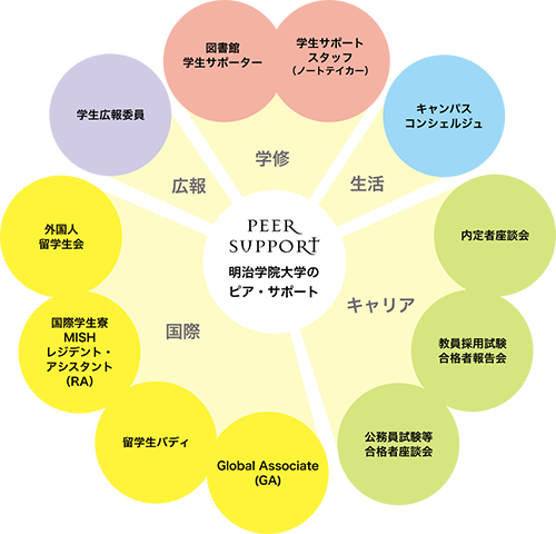 - ピア・サポートとは、学生が学生を支援する取り組みです。支援を求める側にとっては支援者が学生であることで気軽なサポートが受けられ、支援を行なう学生は、サポートを通じて自らを成長させる機会が得られます。学生はピア・サポー トでの支え合いの経験により、本学の教育理念“Do for Others(他者への貢献)”の実践を体現しています。