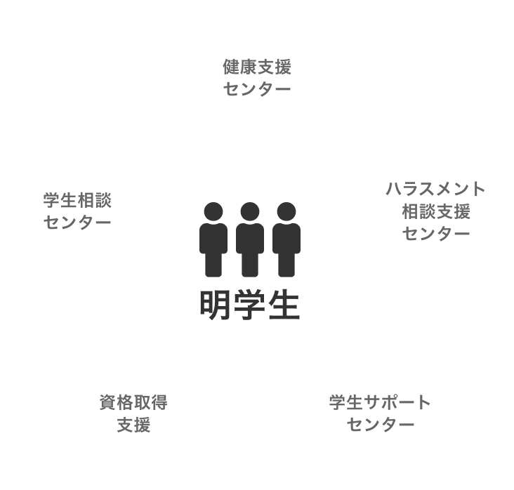 - 学生生活では、予期せぬトラブルや悩みに遭遇することも。明治学院大学では、すべての学生が安心して充実した学生生活を過ごせるために、さまざまな支援体制を整えています。