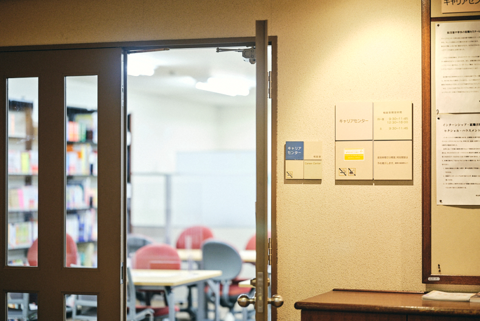 明治学院大学のキャリア支援は、キャリアセンターが入学時に新入生全員に対して行う「キャリアオリエンテーション」から始まります。目的は「学生生活と卒業後の人生は、別個のものでなく、繋がっている」ことを伝え、「学生生活のデザイン」を促すことにあります。学生のキャリアデザインに資する授業科目として1年次から学ぶことのできる「ヘボン・キャリアデザイン・プログラム」では自己理解と母校への定着をテーマとする「ライフデザイン講座1」を開講しています。また、キャリアセンターでは、1年生・2年生向けのインターンシップガイダンスや自己理解をテーマとした講座なども実施します。