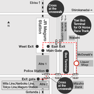 Take the Toei bus for "Ooi Keiba Jo" and get off at "Meiji Gakuin Mae" bus stop. (6 min.)(*Or 20 min. walk)