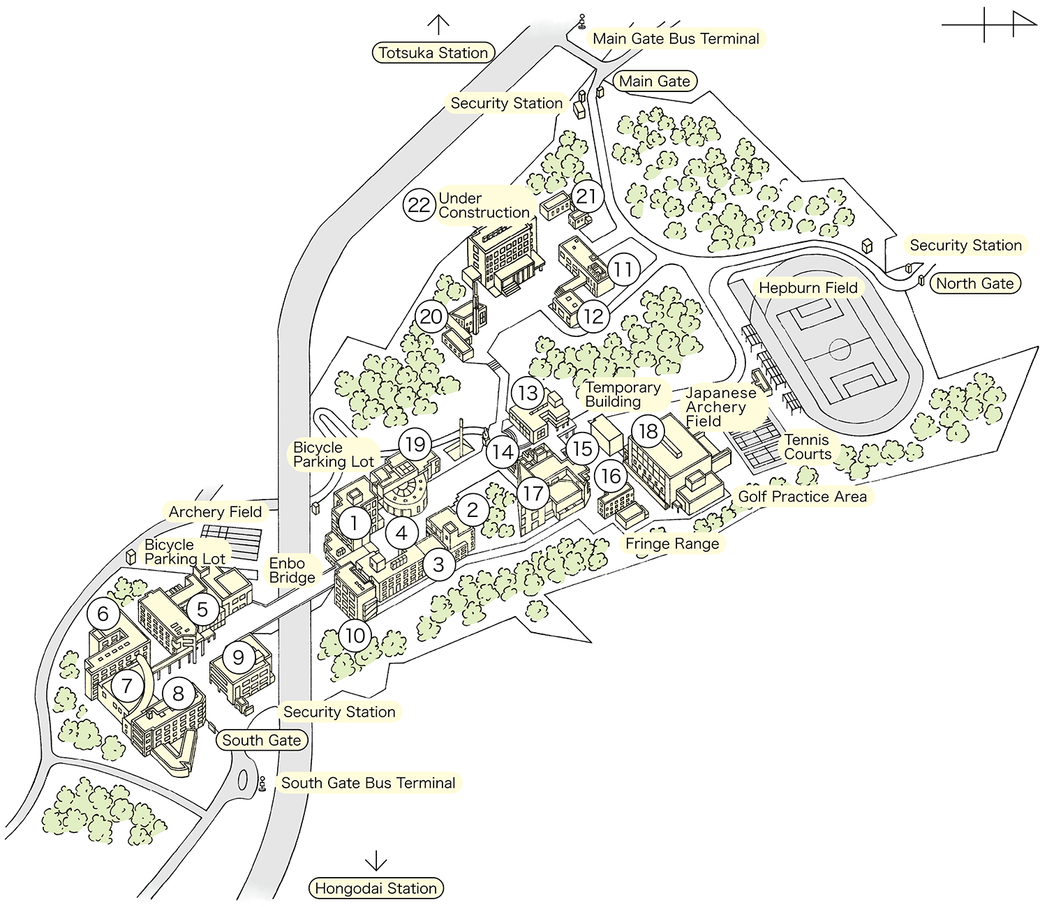 The administrative office building. The open area under the overhang on the ground floor has displays of earthenware excavated during construction of the Yokohama campus.