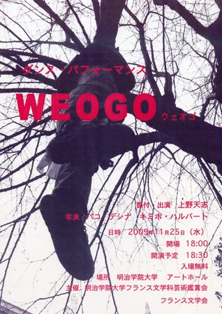 | 上野天志は本学フランス文学科出身、パリで活躍する28歳のコンテンポラリー・ダンサーです。 2006年パリの初リサイタル以来、独自の新しい肉体のパフォーマンスで注目を集めています。 今回の帰国公演では、はじめて振付も手がけ、2人のすぐれた国際的ダンサーとともに踊ります。 パリでの彼の導き手でもある著名な舞踊家パコ・デシナ、日本でのバレエと振付でも広く知られているキミホ・ハルバートが共演! 「WEOGO」とはアフリカ原住民の言葉で、「野獣や精霊の跳梁する土地、人間によって開拓されていない荒野」の意味。 大学のアートホールがまさに「ウェオゴ」となるようなパフォーマンスでしょうか。 上野天志の母校出身学科の主催によるこの魔術的・国際的なショーにご期待を! |