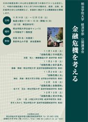 | 講演会日程 | 第1回 11月14日(土)「金融危機と日本経済」 池尾 和人 慶應義塾大学 経済学部 教授 第2回 11月21日(土)「金融危機と会計基準」 斎藤 静樹 明治学院大学 経済学部国際経営学科 教授 第3回 11月28日(土) 「金融危機と法」 神田 秀樹 東京大学大学院 法学政治学研究科 教授 第4回 12月 5日(土) 「金融危機と金融規制」 佐々木 百合 明治学院大学 経済学部経済学科 教授 第5回 12月12日(土) 「金融危機と資本市場」 仁科 一彦 大阪大学大学院 経済学研究科 教授; 来年4月から明治学院大学 経済学部国際経営学科 教授 |