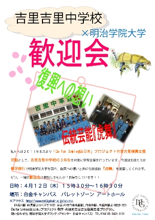 | 明治学院大学のボランティアセンターは、東日本大震災の復興支援を目的に 「Do for Smile@東日本」プロジェクトを立ち上げ、学生ボランティアを通じて、 岩手県大槌町と交流を深めてきました。 その復興支援活動の一つに、吉里吉里中学校の3年生を対象に行う学習支援があります。 今回は、吉里吉里中学校の生徒たちが明治学院大学を訪れ、復興への想いと共に 伝統芸能『虎舞』を披露してくれます。 ぜひご参加ください。 |