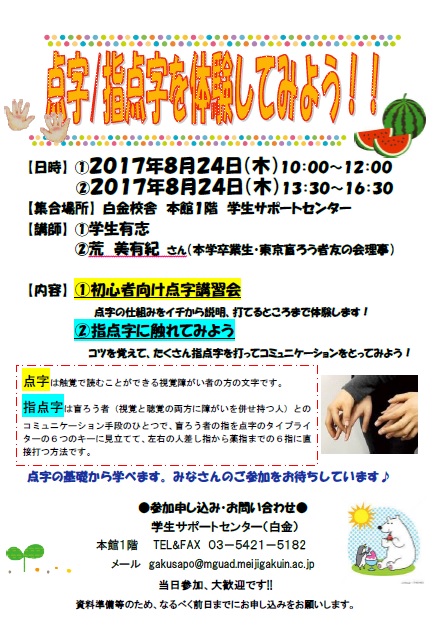 | 【8月24日(木) 開催】 “点字”・“指点字”を体験してみよう!! | 【講師】 ①学生有志 学生有志 ②荒 美有紀 美有紀 さん (本学卒業生・東京盲ろう者友の会理事) 【内容】 ①初心者向け 点字 講習会 点字 の仕組みをイチから説明、打てるところまで体験します! ② 指点字 に触れてみよう コツを覚えて、たくさん指点字を打って コミュニケーションをとってみよう! 点字の基礎から学べます。みなさんご参加をお待ちしています♪ ~*~*~*~*~*~*~*~*~*~*~*~*~*~*~*~*~*~*~*~*~*~*~ 【点字】は触覚で読むことがきる視覚障がい者の方の文字です。 【指点字】は盲ろう者(視覚と聴の 両方に障がいを併せ持つ人)との コミュニケーション手段のひとつで、盲ろう者の指を点字のタイ プラターの 6つのキーに見立て、左右人差し指から薬指まで6指に直接打つ方法です。 ~*~*~*~*~*~*~*~*~*~*~*~*~*~*~*~*~*~*~*~*~*~*~ ●参加申し込み・お問い合わせ● 学生サポートセンター(白金)本館1階 TEL&FAX 03-5421-5182 メール gakusapo@mguad.meijigakuin.ac.jp 当日参加 、大歓迎です !! 資料準備等のため、なるべく前日までにお申し込みをお願います。 |