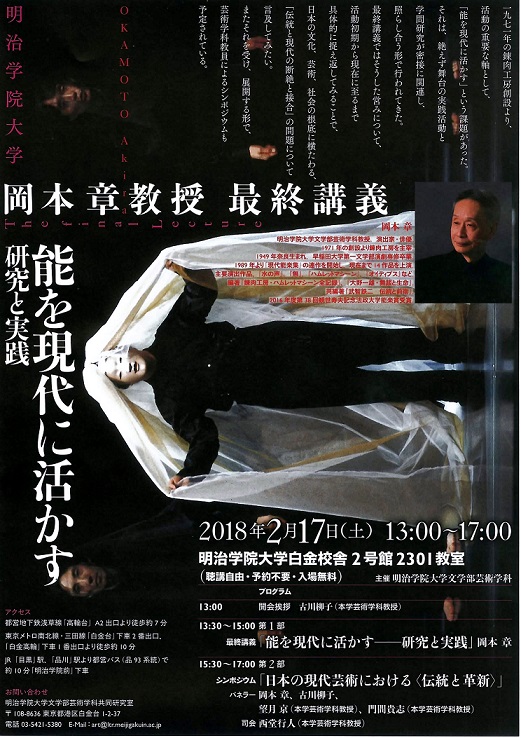 | プログラム | 開会挨拶 13:00 古川柳子(本学芸術学科教授) 第一部 13:30~15:00 最終講義「能を現代に活かす――研究と実践」 岡本章 第二部 15:30~17:00 シンポジウム「日本の現代芸術における〈伝統と革新〉」 【パネラー】岡本章、古川柳子、望月京(本学芸術学科教授)、門間貴志(本学芸術学科教授) 【司 会】西堂行人(本学芸術学科教授) |