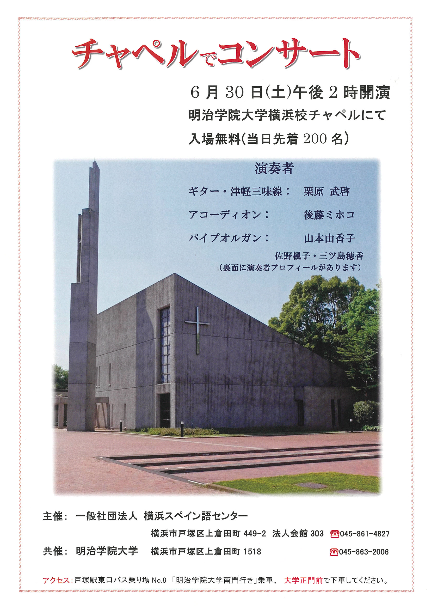 | 会場 | 明治学院 横浜キャンパス チャペル 入場無料 ♪学生も一般の皆様もご自由にご鑑賞頂けます♪ |