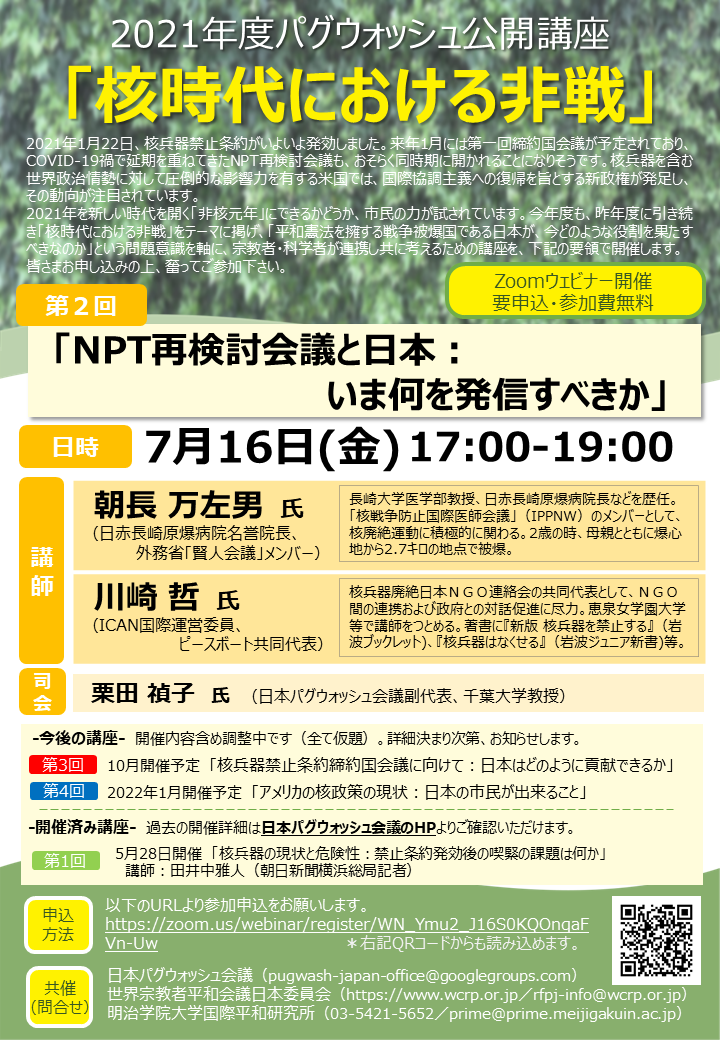 2021年度 パグウォッシュ連続講座 2021年1月22日、核兵器禁止条約がいよいよ発効しました。来年1月には第一回締約国会議が予定されており、COVID-19禍で延期を重ねてきたNPT再検討会議も、おそらく同時期に開かれることになりそうです。核兵器を含む世界政治情勢に対して圧倒的な影響力を有する米国では、国際協調主義への復帰を旨とする新政権が発足し、その動向が注目されています。 講師: 朝長万左男(日赤長崎原爆病院名誉院長、外務省「賢人会議」メンバー) 日時: 7月16日(金) 17:00~19:00 共催:日本パグウォッシュ会議/世界宗教者平和会議日本委員会(WCRP)/明治学院大学国際平和研究所(PRIME) |