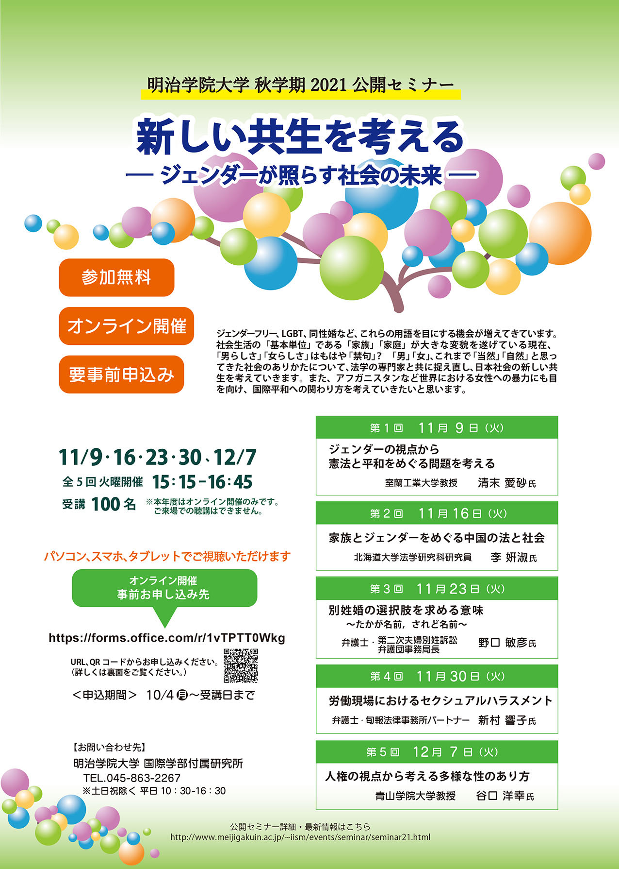| 第1回 11/ 9 清末 愛砂氏(室蘭工業大学教授) 第2回 11/16 李 姸淑氏(北海道大学法学研究科研究員) 第3回 11/23 野口 敏彦氏(弁護士・第二次夫婦別姓訴訟弁護団事務局長) 第4回 11/30 新村 響子氏(弁護士・旬報法律事務所パートナー) 第5回 12/ 7 谷口 洋幸氏(青山学院大学教授) |