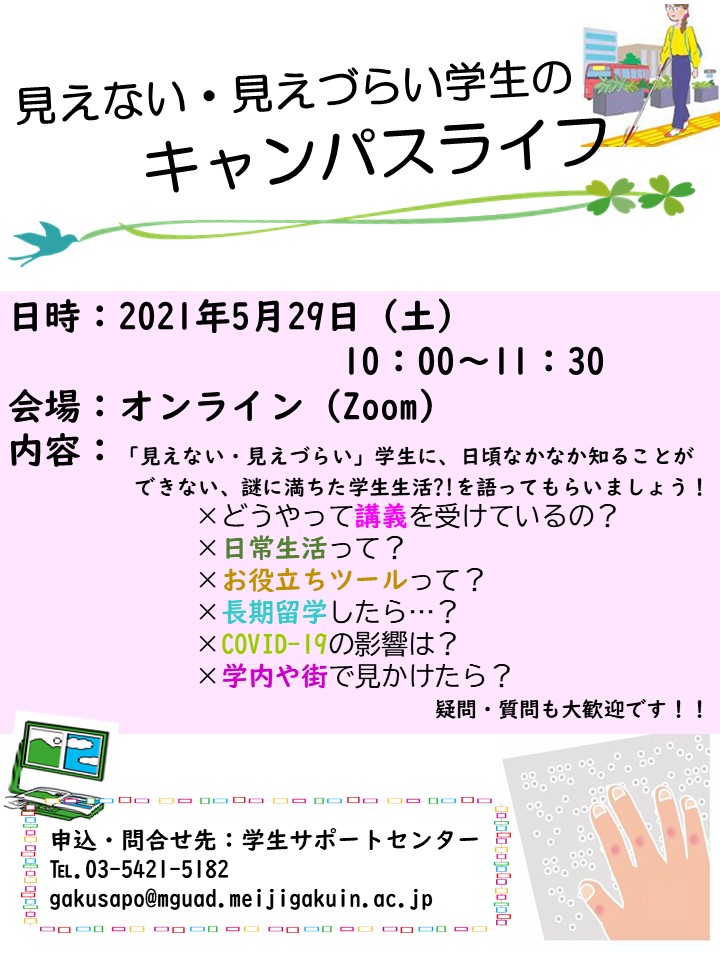 | 内容 | 「見えない・見えづらい学生」 ×どうやって講義を受けているの? ×日常生活って? ×お役立ちツールって? ×長期留学をしたら…? ×COVID-19の影響は? ×学内や街で見かけたら? |