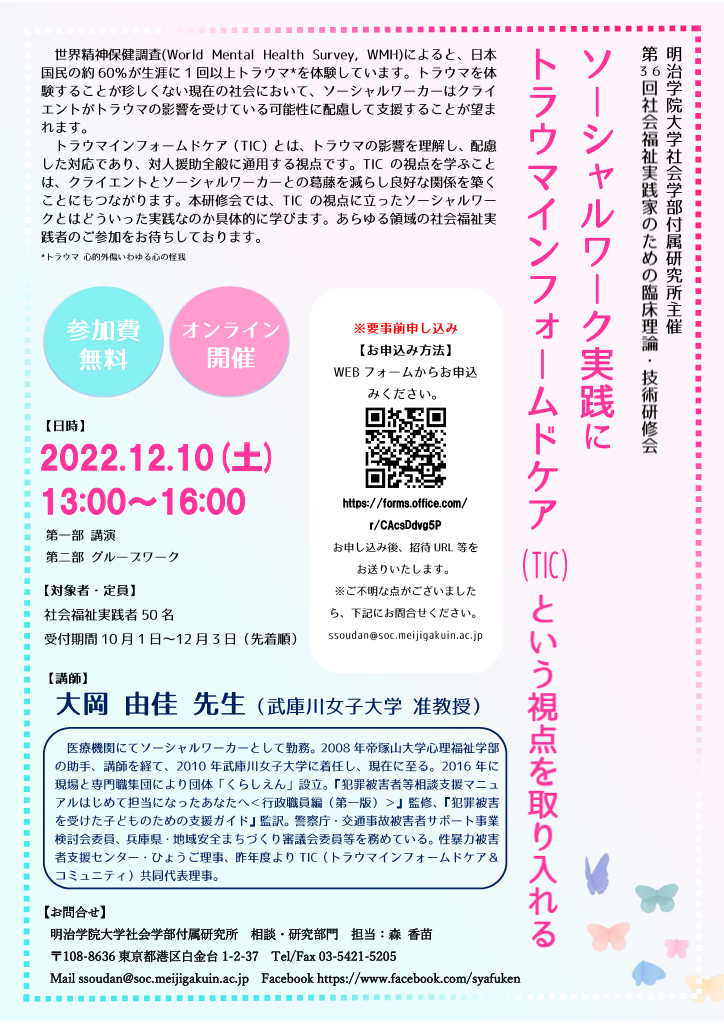 世界精神保健調査(World Mental Health Survey, WMH)によると、日本国民の約60%が生涯に1回以上トラウマ*を体験しています。トラウマを体験することが珍しくない現在の社会において、ソーシャルワーカーはクライエントがトラウマの影響を受けている可能性に配慮して支援することが望まれます。 トラウマインフォームドケア(TIC)とは、トラウマの影響を理解し、配慮した対応であり、対人援助全般に通用する視点です。TICの視点を学ぶこと、クライエントとソーシャルワーカーとの葛藤を減らし良好な関係を築くことにもつながります。本研修会ではTICの視点に立ったソーシャルワークとはどういった実践なのか具体的に学んで参ります。あらゆる領域の社会福祉実践者のご参加をお待ちしております。 *トラウマ 心的外傷いわゆる心の怪我 |