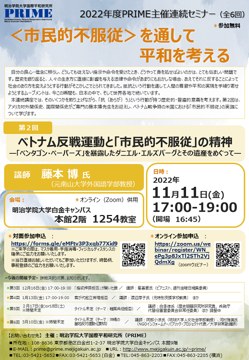 2022年度 PRIME主催連続セミナー (全6回予定) <市民的不服従>を通して平和を考える 自分の良心・信念に照らし、どうしても従えない指示や命令を受けたとき、どうやって身を処せばよいのかは、とても悩ましい問題です。歴史を振り返ると、人々の生き方に直接に影響を与える法律や命令があまりにもおかしな場合、あえてそれに反することによって社会のあり方を変えようとする行動がそこかしこでとられてきました。抵抗という行動を通して人間の尊厳や平和の実現を手繰り寄せようとするムーブメントは、今この瞬間も、日本の中で、そして世界各地で続いています。 第2回 ベトナム反戦運動と「市民的不服従」の精神 日時: 11月11日(金) 17:00~19:00(開場16:45) 主催: 明治学院大学国際平和研究所(PRIME)