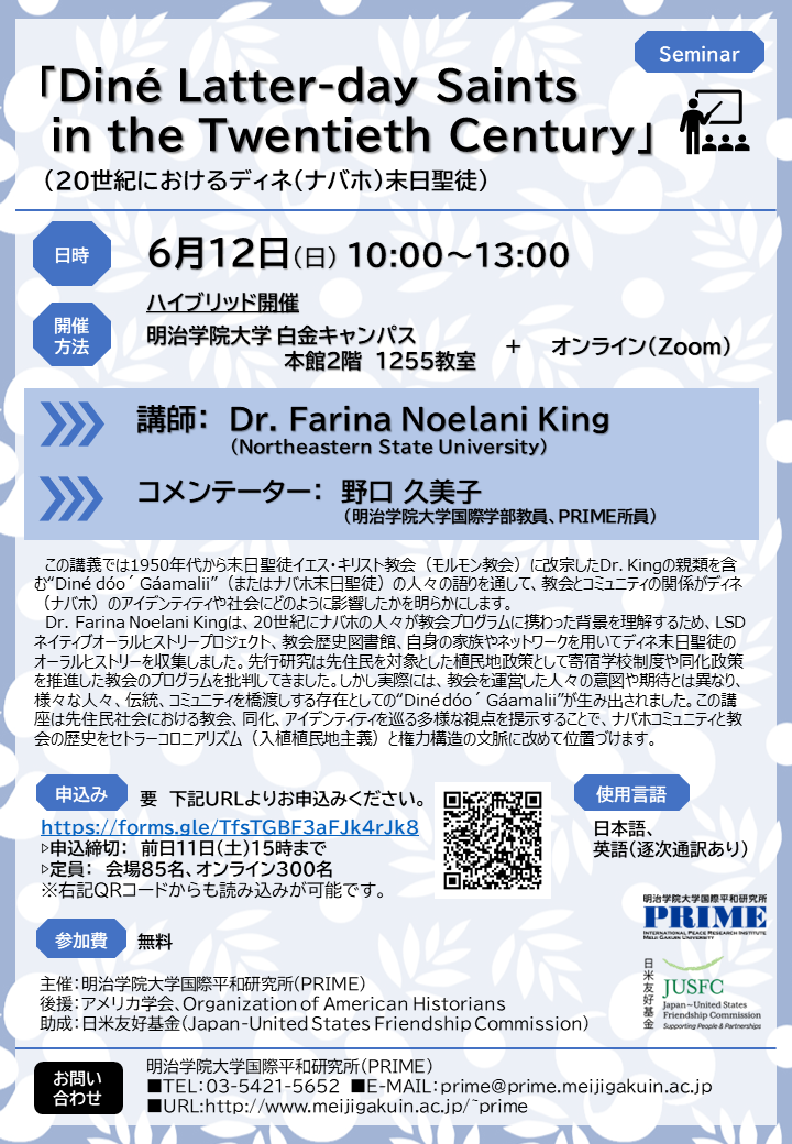 PRIME主催講演会 この講義では1950年代から末日聖徒イエス・キリスト教会(モルモン教会)に改宗したDr. Kingの親類を含む“Diné dóó Gáamalii”(またはナバホ末日聖徒)の人々の語りを通して、教会とコミュニティの関係がディネ(ナバホ)のアイデンティティや社会にどのように影響したかを明らかにします。 日時 : 2022年6月12日(日)10:00~13:00 タイトル: 「Diné Latter-day Saints in the Twentieth Century」(20世紀におけるディネ(ナバホ)末日聖徒) 主催: 明治学院大学国際平和研究所(PRIME) |