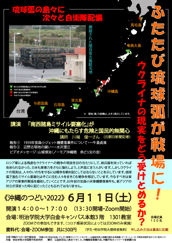 ロシア軍による残虐なウクライナへの戦争の現実を目の当たりにして、核兵器を持っていれば攻められなかった、日本も軍事力をさらに強化しよう、と声高に言う人がいます。しかしウクライナの現実は、人々のいのちを守るには戦争を絶対起こしてはならないことを示しています。琉球弧で進むミサイル要塞化はそこに住む人々をまきこむ戦争を想定しています。今なすべきは東アジアの軍事的緊張を緩和していくことです。63年前の宮森小米軍機墜落事件も、東アジアの対立が深まった時に起こったことも忘れてはなりません。 日時:6月11日(土) 14:00~17:00(開場13:30)