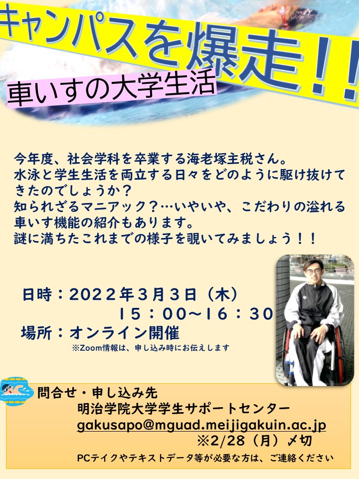 | 内容 | 今年度社会学科を卒業する海老塚主税さん。 水泳と学生生活を両立する日々をどのように駆け抜けてきたのでしょうか? 知られざるマニアック?…いやいや、こだわりの溢れる車いす機能の紹介もあります。 謎に満ちたこれまでの様子を覗いてみましょう!! |