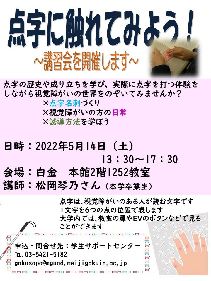 | 内容 | ・点字の歴史や成り立ちを学び、実際に打ってみよう! ・点字名刺を作ってみよう! ・視覚障がいの方の日常を知ろう! ・誘導方法を学ぼう! ☆講師は、卒業生の松岡琴乃さんです |