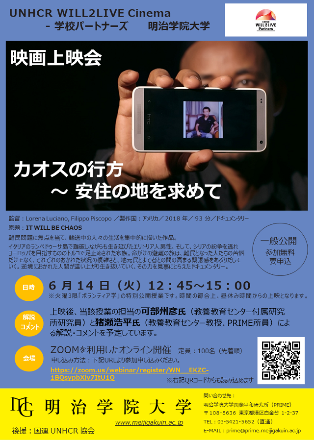 | 開催概要 | UNHCR WILL2LIVE Cinema 学校パートナーズ 明治学院大学 映画上映&トーク 2018年度からUNHCR難民高等教育プログラムに参加している明治学院大学では、UNHCR WILL2LIVE Cinema 学校パートナーズ参加校として、毎年映画上映会を開催しています。今年度第1回目の開催となる本会は、ドキュメンタリー映画『カオスの行方 ~ 安住の地を求めて』をオンライン上映いたします。今回のイベントは、公開授業としての開催となります。 ■日時:2022年6月14日(火)12:45~15:00(昼休み~3限) 上映作品:『カオスの行方 ~ 安住の地を求めて』 <タイムテーブル> ■主催:明治学院大学 |