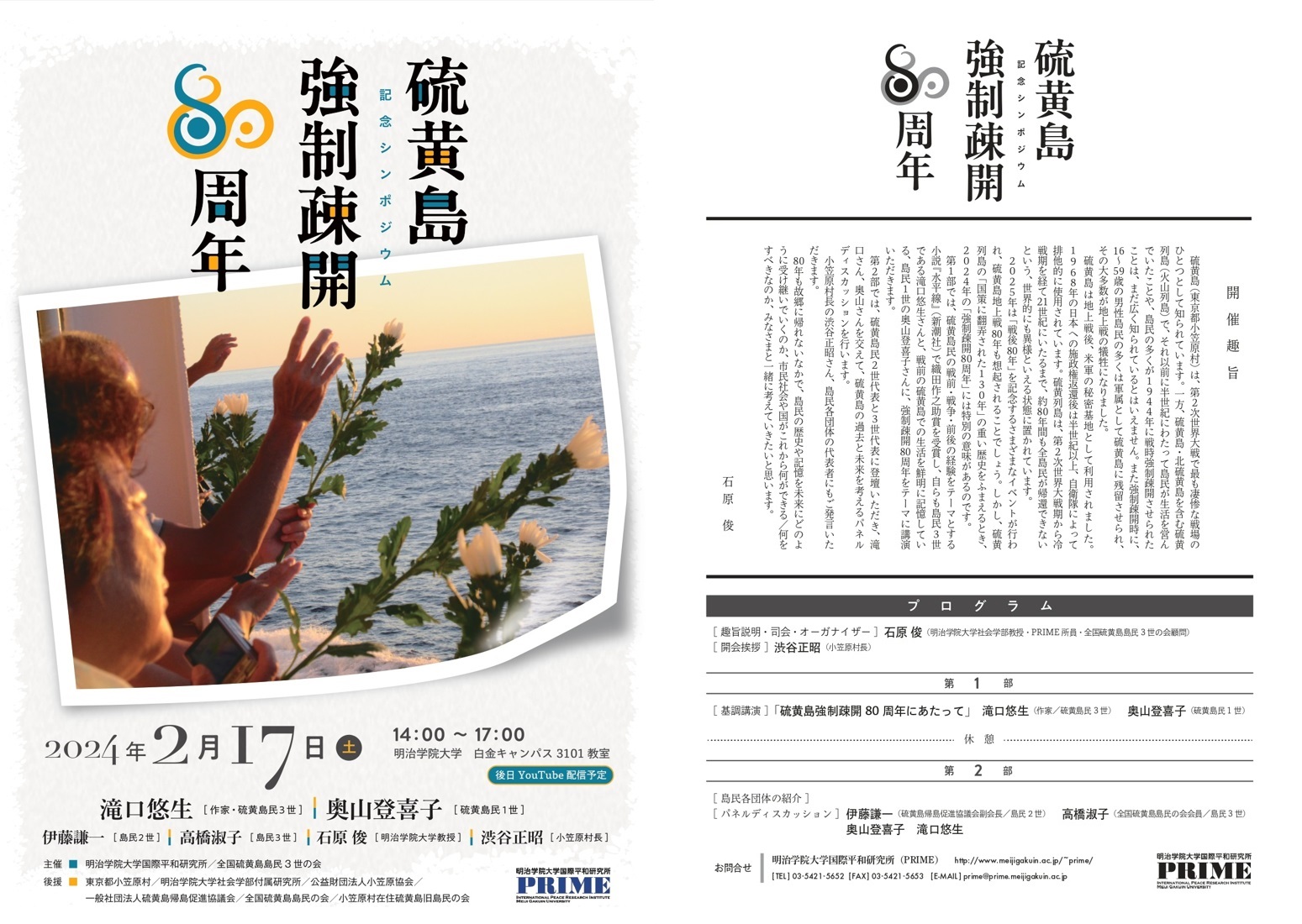 | 主催 | 明治学院大学国際平和研究所(PRIME)/全国硫黄島島民3世の会 |