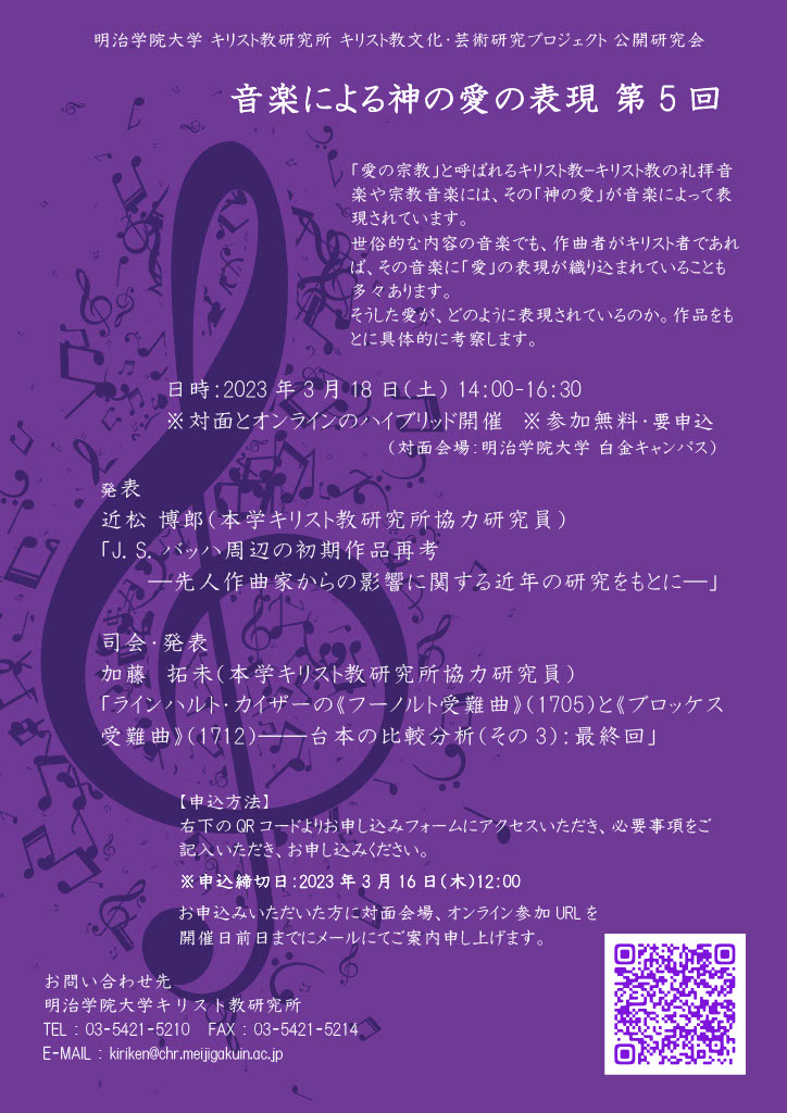 関連リンクhttp://www.meijigakuin.ac.jp/~kiriken/event/%e5%85%ac%e9%96%8b%e7%a0%94%e7%a9%b6%e4%bc%9a%e3%80%8c%e9%9f%b3%e6%a5%bd%e3%81%ab%e3%82%88%e3%82%8b%e7%a5%9e%e3%81%ae%e6%84%9b%e3%81%ae%e8%a1%a8%e7%8f%be-%e7%ac%ac5%e5%9b%9e%e3%80%8d/ |